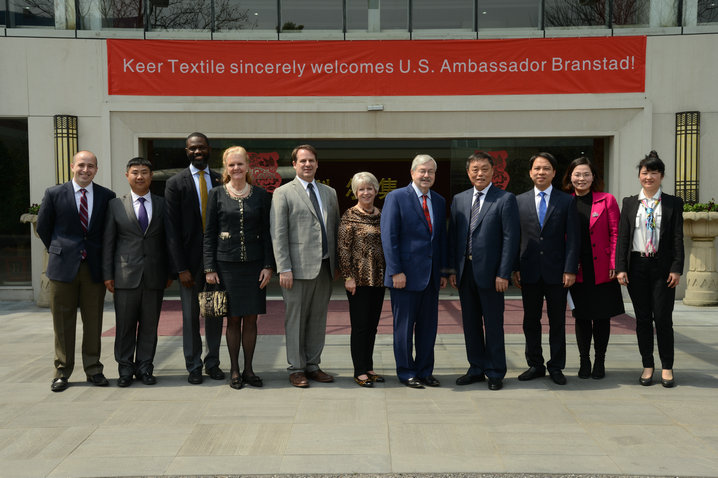 3月24日,美國駐華大使特里.布蘭斯塔德率代表團赴杭州走訪考察浙江航民科爾紡織有限公司,并就當前形勢下航民科爾在美國的海外發展、美棉使用情況及后續的發展規劃等進行座談。航民集團董事長朱重慶、科爾集團副總經理黃國剛、投資部經理湯凱、董事長助理崔曉慧、航民科爾副總經理何春嵐參加座談會。