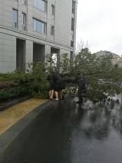 一夜的狂風(fēng)驟雨過后,小區(qū)部分樹枝樹木斷裂傾倒,幾株較大的樹木橫亙于小區(qū)主干道,極易造成下水道管道堵塞,路面積水堆積,影響業(yè)主正常通行和人身安全,秩序維護(hù)部各應(yīng)急小分隊立即趕往現(xiàn)場處理倒伏樹枝,不間斷在小區(qū)公共區(qū)域巡邏并攙扶部分年長業(yè)主通過架空層;設(shè)施部工作人員緊急檢修各區(qū)域破損路燈,以及部分設(shè)備間的積水;保潔清理排屋區(qū)業(yè)主露臺陽臺的積水地漏,地下車庫排水管道;各區(qū)管家檢查樓棟內(nèi)各設(shè)備間、消防通道門窗,積水等情況。